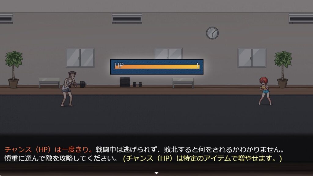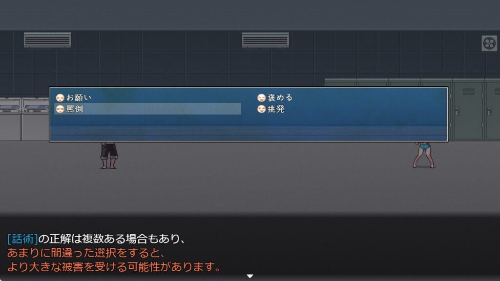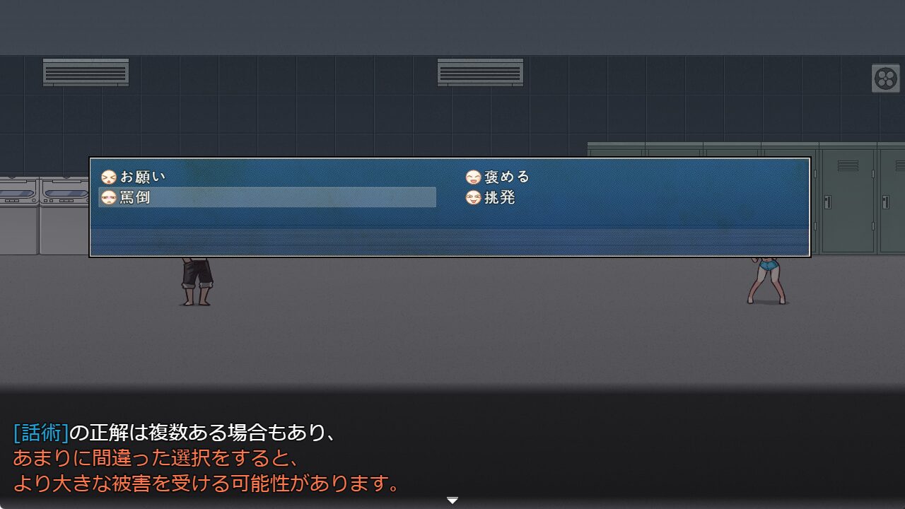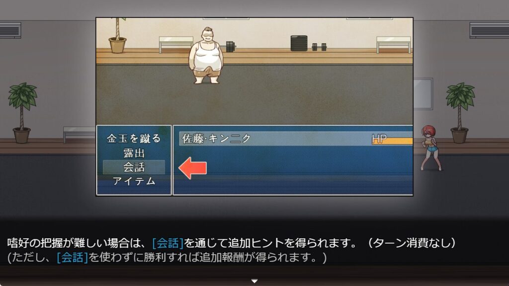 戦闘では金玉を蹴る・露出・話術・会話・アイテム・諦めるがあります。